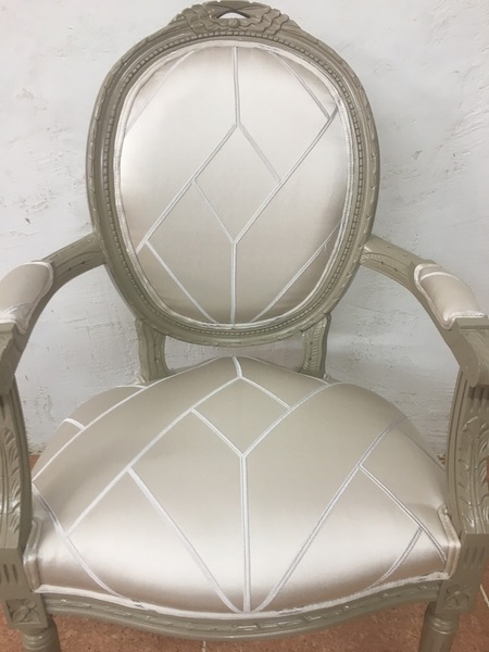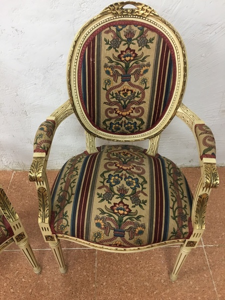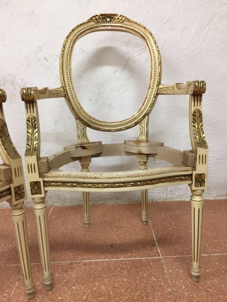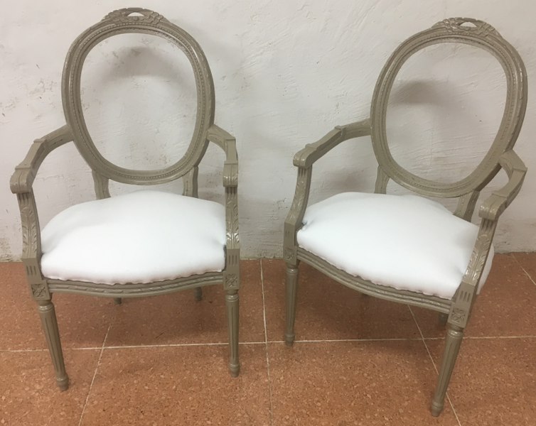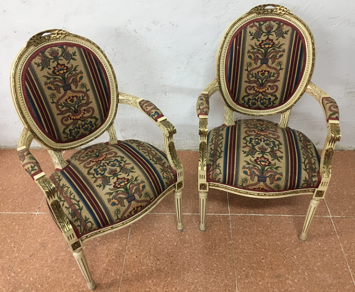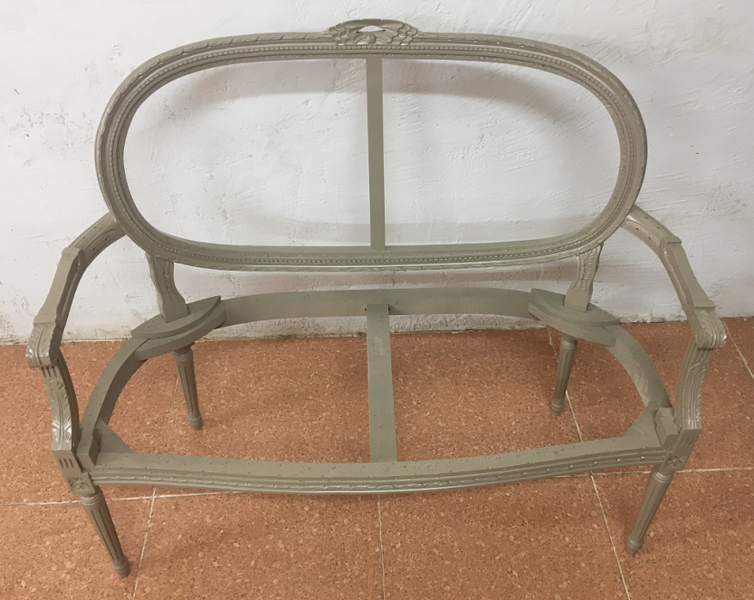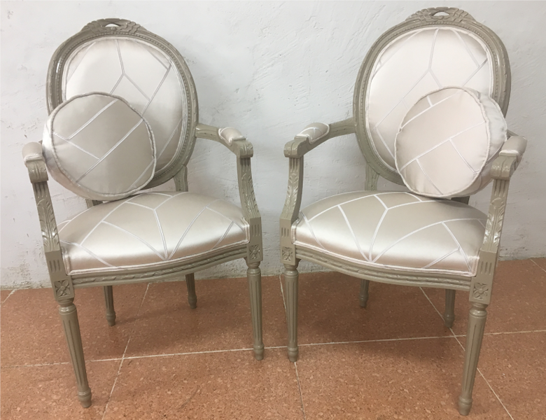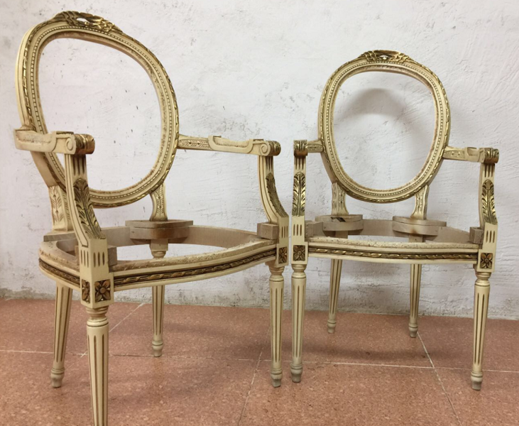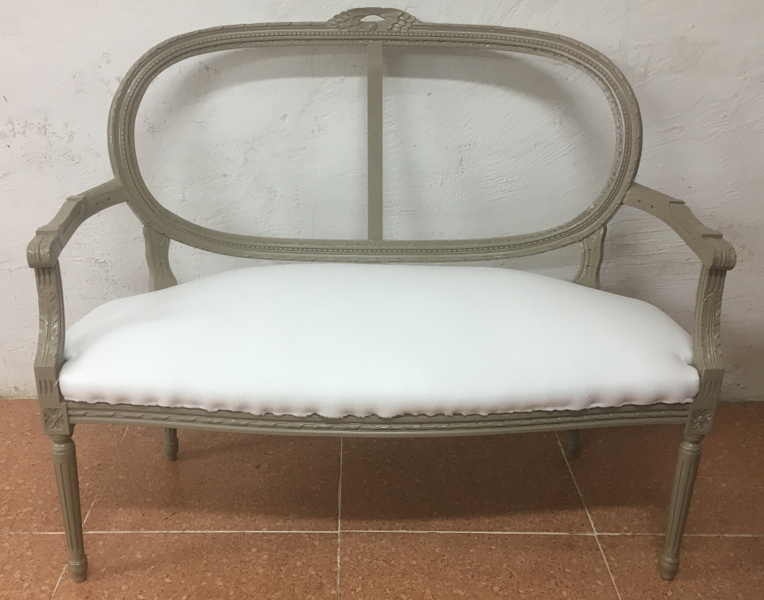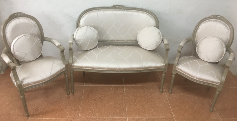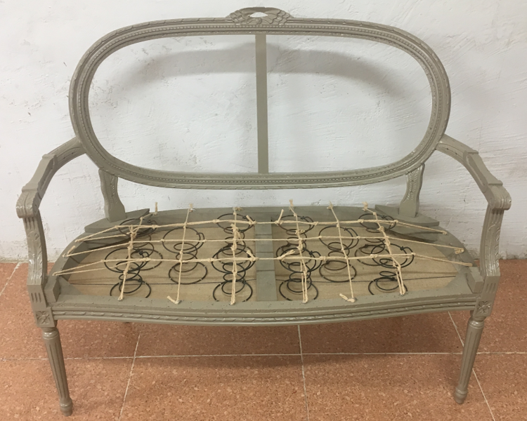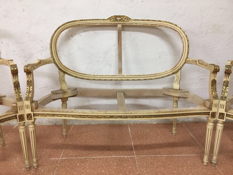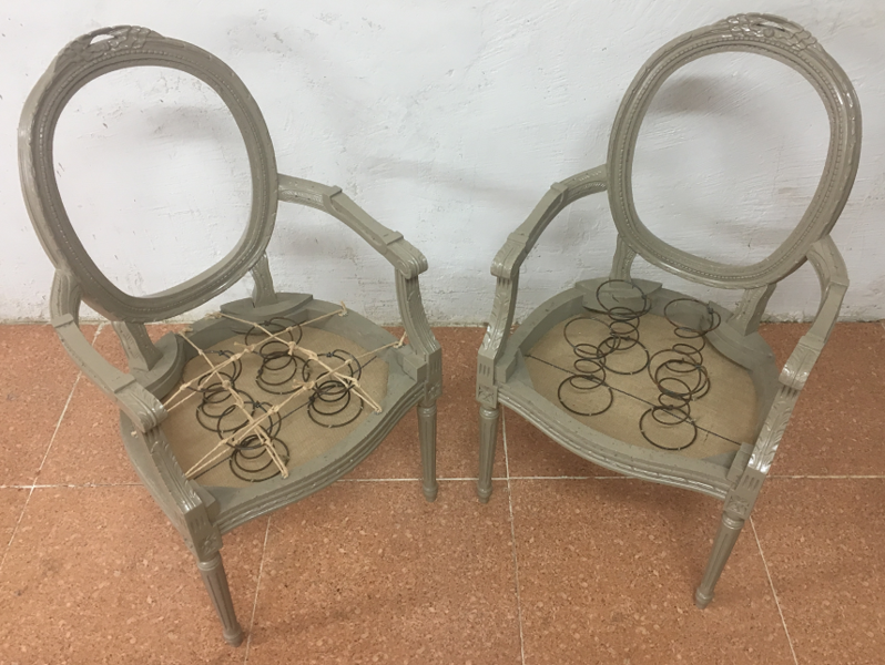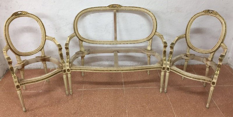 El trabajo realizado a los muebles a sido el desclavado del todo hasta dejarlo en la madera, para continuación restaurar la madera y lacar, una vez restaurado, nos disponemos a tapizar, primero lo cinchamos con lona aragonesa y enciman van los muelles, que se atan con cuerda de cañamo y todo hecho a mano, un trabajo artesano.
