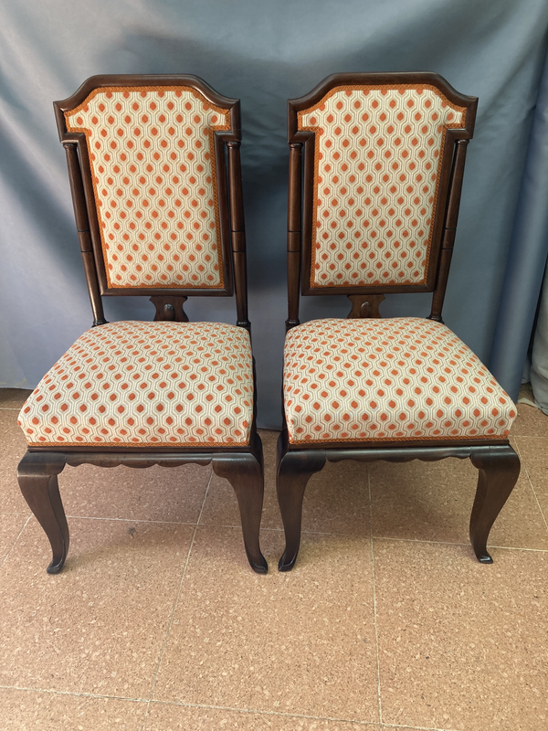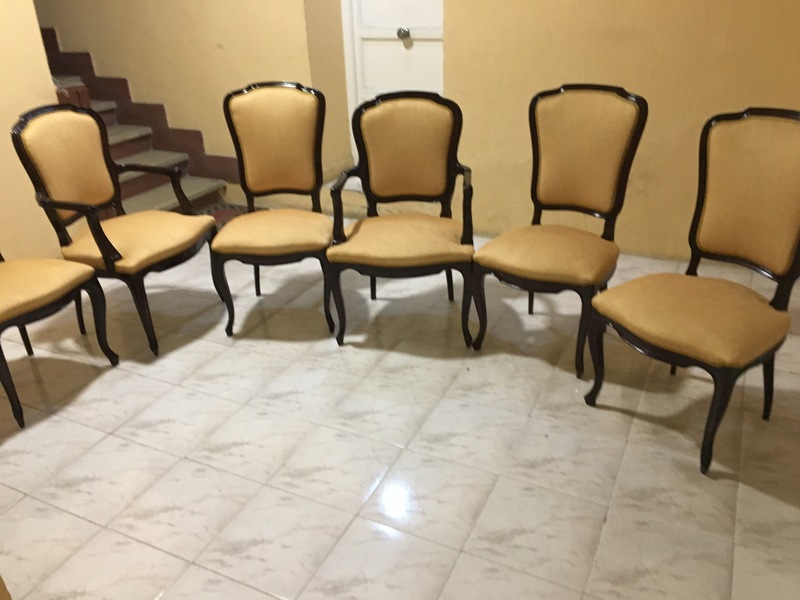 Tapizado de seis sillas con asiento de bastidor, a los asientos se le desclavo todo y se puso gomaespuma nueva de 25 kilos dura, tela de tapicería, la madera de las sillas fue restaurada y barnizada.