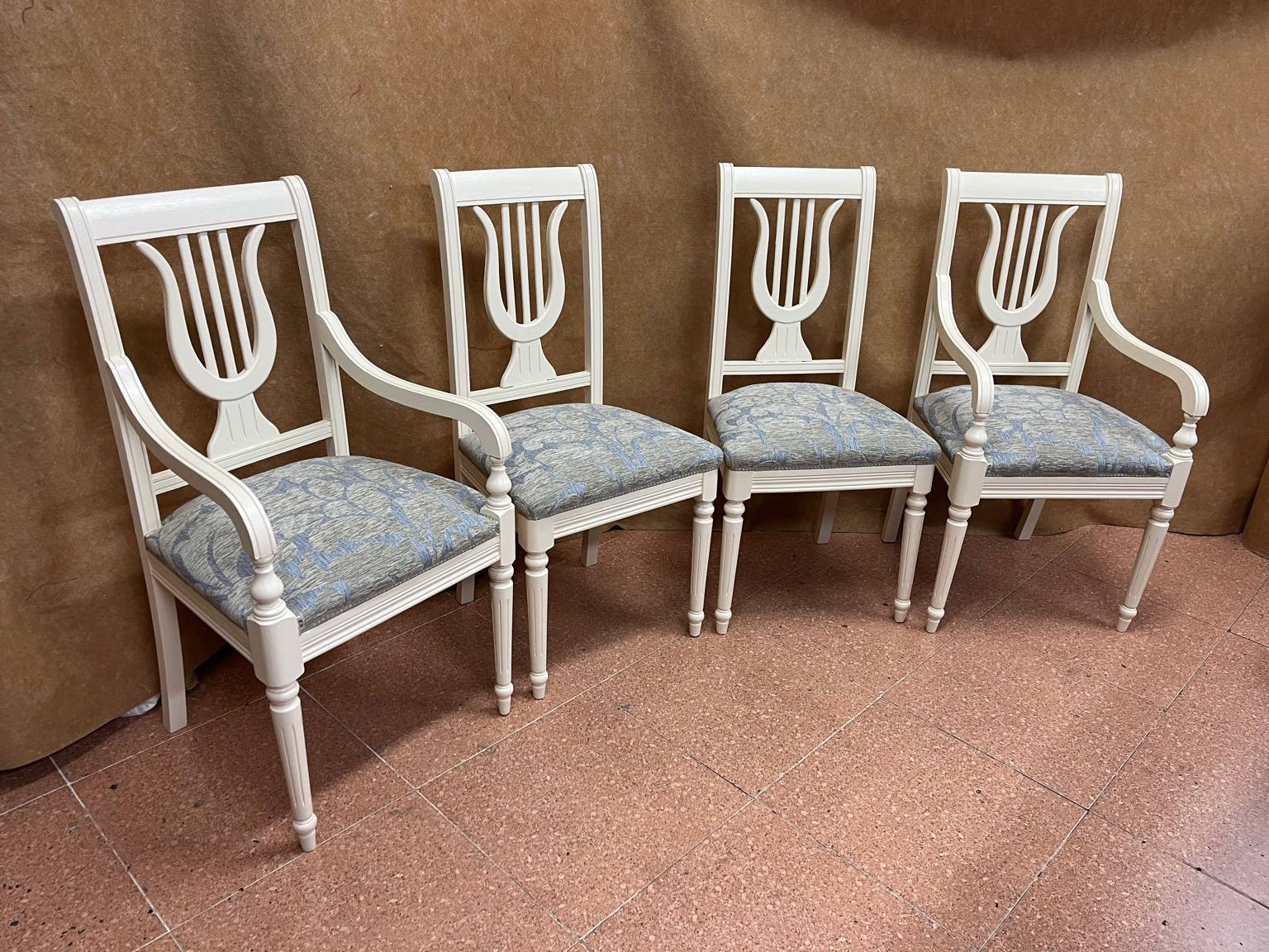 Trabajo de tapizado de sillas clásicas realizado en nuestro taller de tapicería en Madrid, sustituyendo rellenos y renovando la tela con un acabado artesanal y duradero.